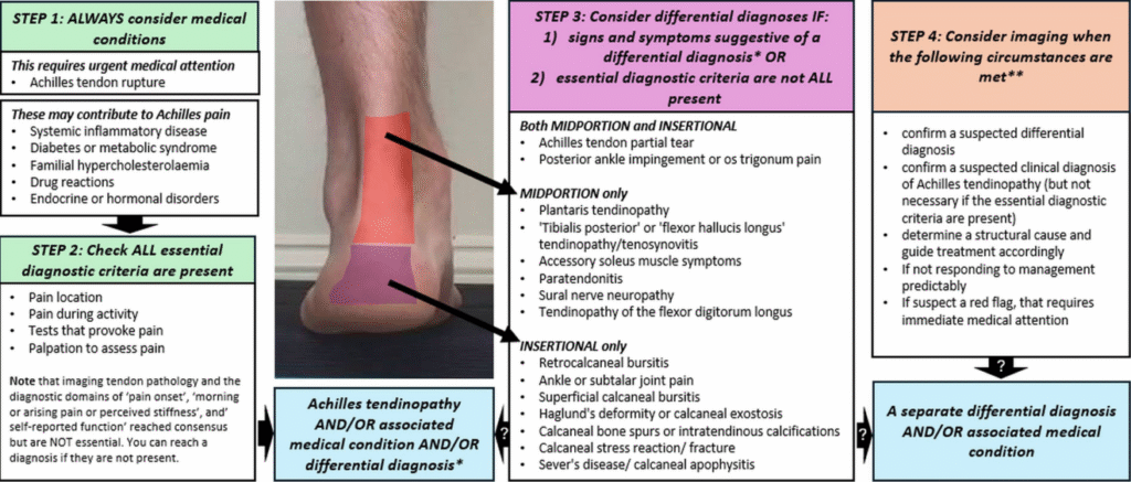 - Chimenti, R. L., Neville, C., Houck, J., Cuddeford, T., Carreira, D., & Martin, R. L. (2024). Achilles Pain, Stiffness, and Muscle Power Deficits: Midportion Achilles Tendinopathy Revision – 2024. Journal of Orthopaedic & Sports Physical Therapy, 54(12), CPG1–CPG32.