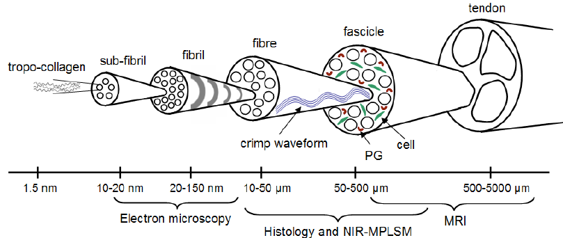 A nivel microestructural, mantiene una arquitectura jerárquica (fibrillas → fibras → fascículos) con crimp (ondulación) que se “endereza” al cargar, contribuyendo a la transmisión de fuerza y la disipación de tensiones. (Freedman et al., 2014).